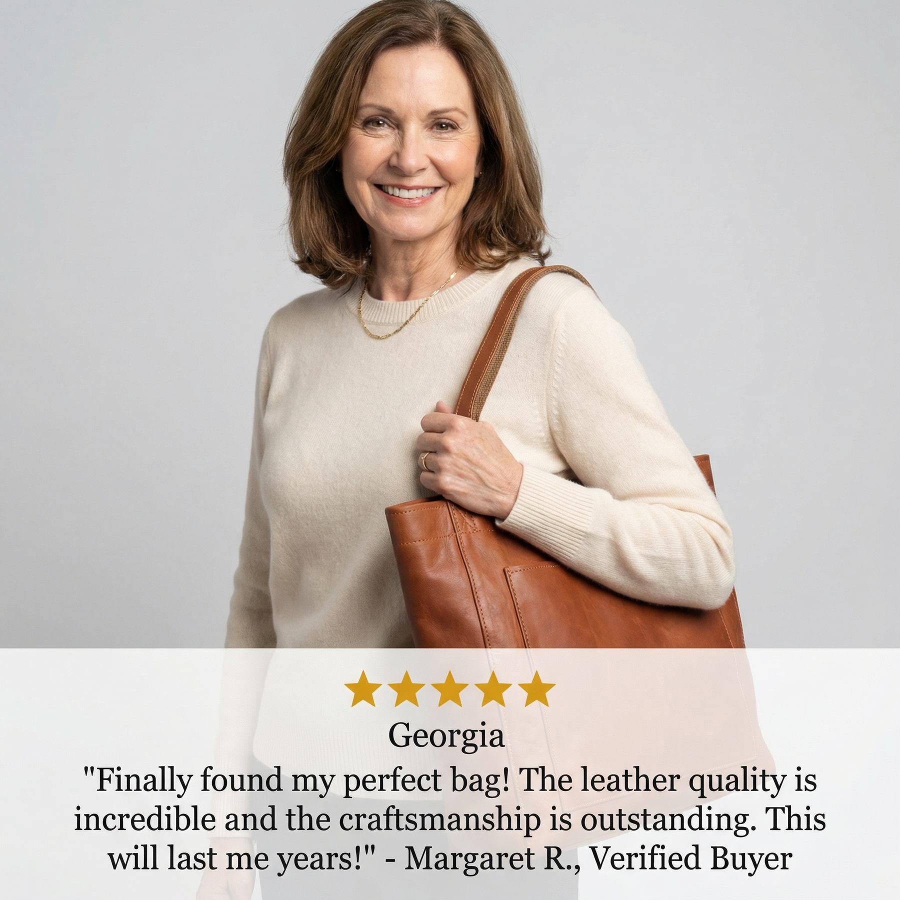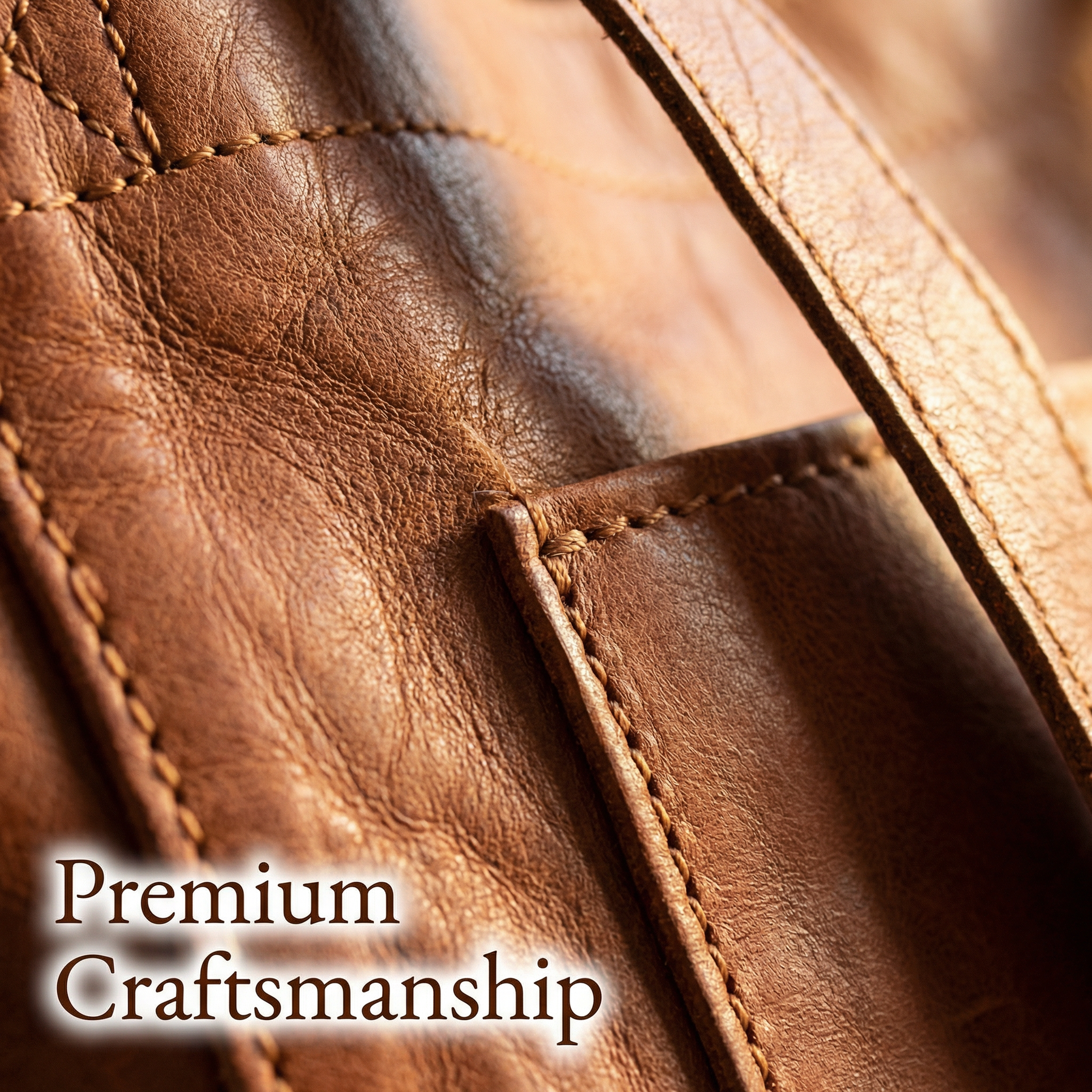 Our bags are made from premium vegan leather, a high-quality alternative that offers the same luxurious look and feel as traditional leather while being more durable and easier to maintain. It's water-resistant, won't crack or peel, and keeps looking new for years.